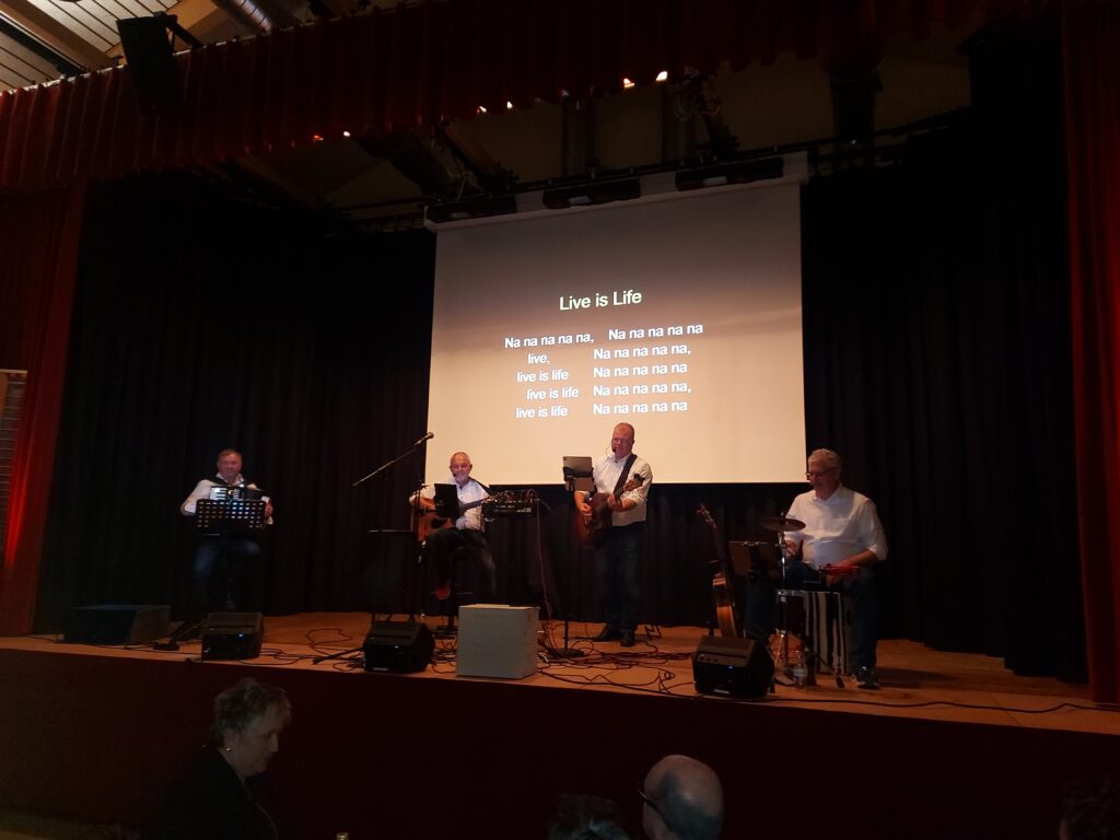 Rund 170 Besucherinnen und Besucher waren beim Mitsingkonzert zugunsten der Bürgerstiftung Langenargen im Dorfgemeinschaftshaus in Oberdorf zusammengekommen. Initiiert wurde das Konzert von Wolfgang Bosch gemeinsam mit seinen „Saitenreisser“-Bandkollegen Peter Appl (Zither), Christoph Nowag (Gitarre) und Michael Kalmbach (Schlagzeug).